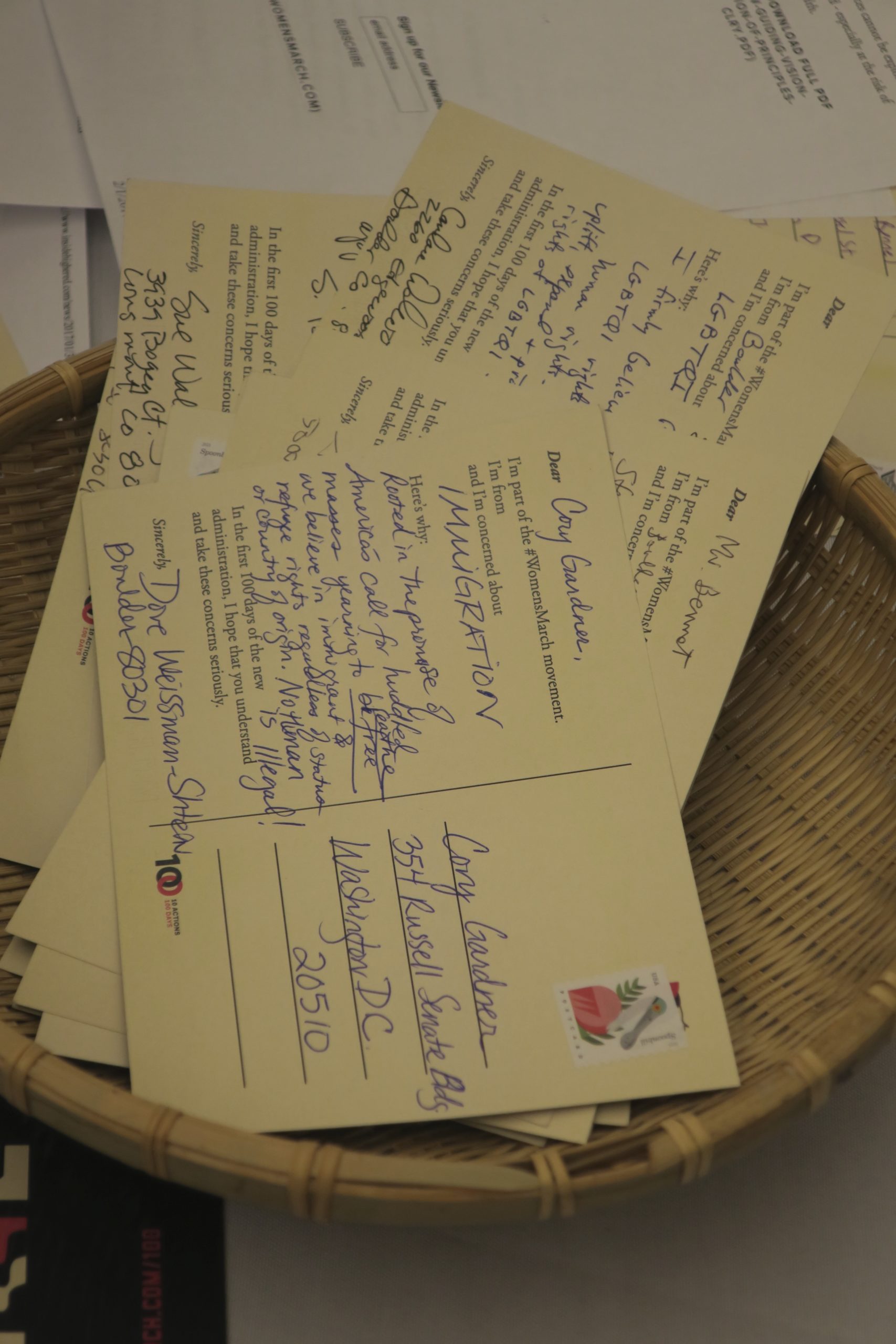 Building on the momentum of these and other marches worldwide, I snagged a table in the Naropa Pavilion to channel the energy of creative protest into civic action–writing to senators Gardner and Bennet.