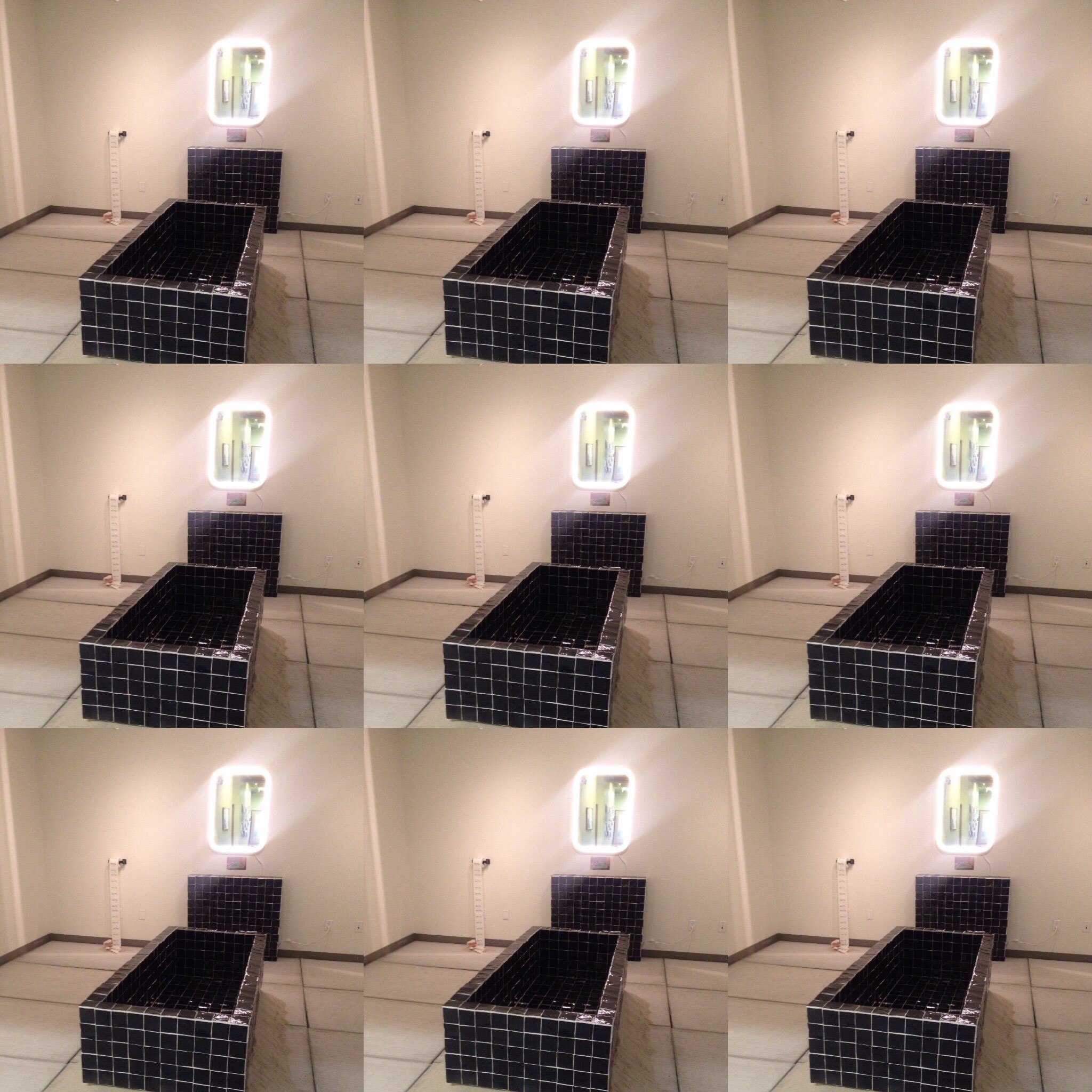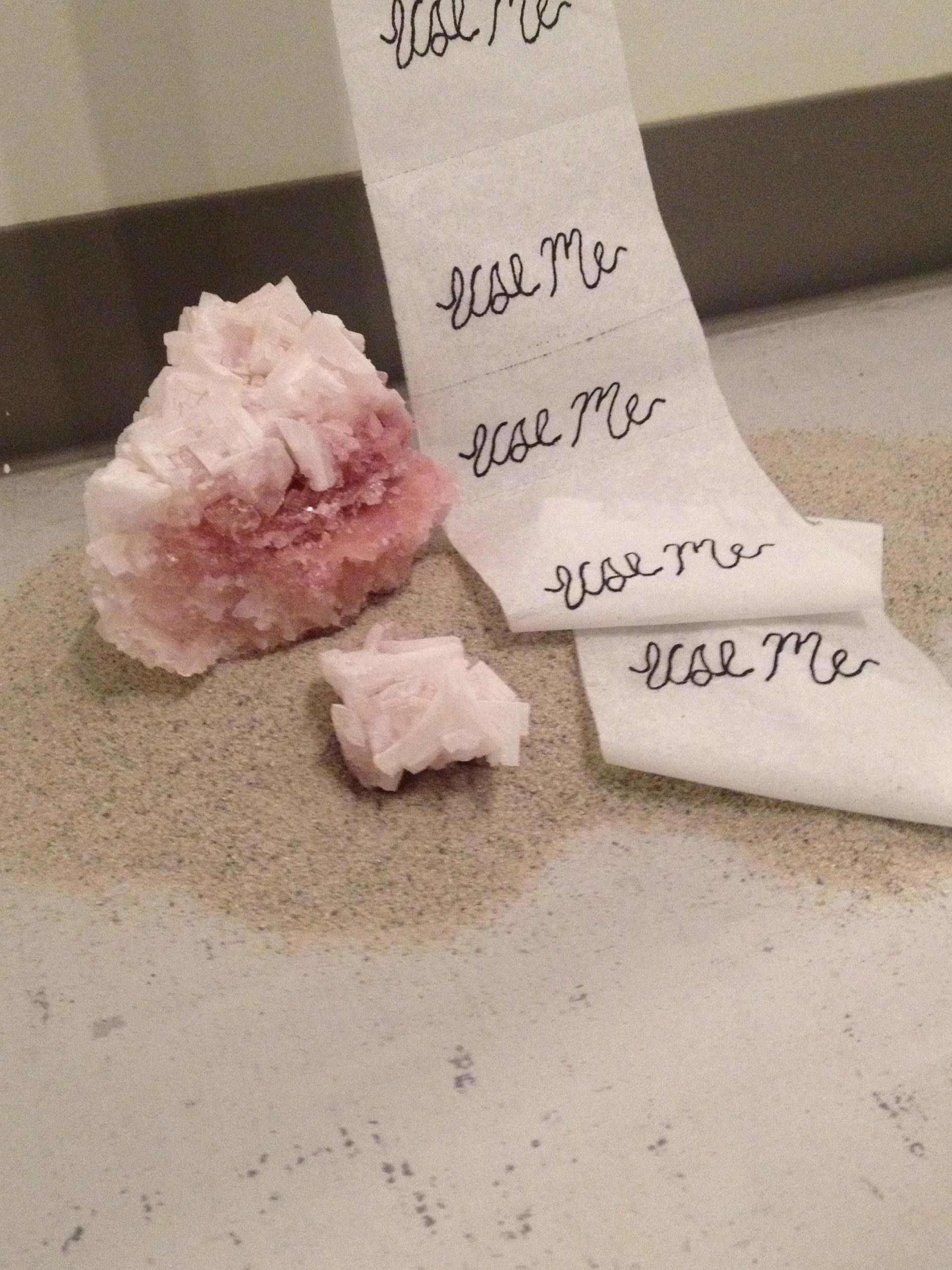 In their culminating thesis exhibition, Darius Khonsary has turned the student gallery into a porcelain dimension reflecting the complex imposition of maturing identity in the binary zones. In order to transpose the experience of binary address in language between the language of culture and mother-tongue, Darius eruditely uses various visual media. The landscape itself is sparse, almost beach like with its textile floor, hand-built tile vanity and tub with sand at its feet. There is a faint glow emanating from the lights around the retro-style mirror. Beside this hangs a roll of toilet paper with ‘use me’ printed on each square, cascading onto the floor where a cracked pink crystal geode exists as a would-be paper weight, speaking to the gendered chaos of this ablution.